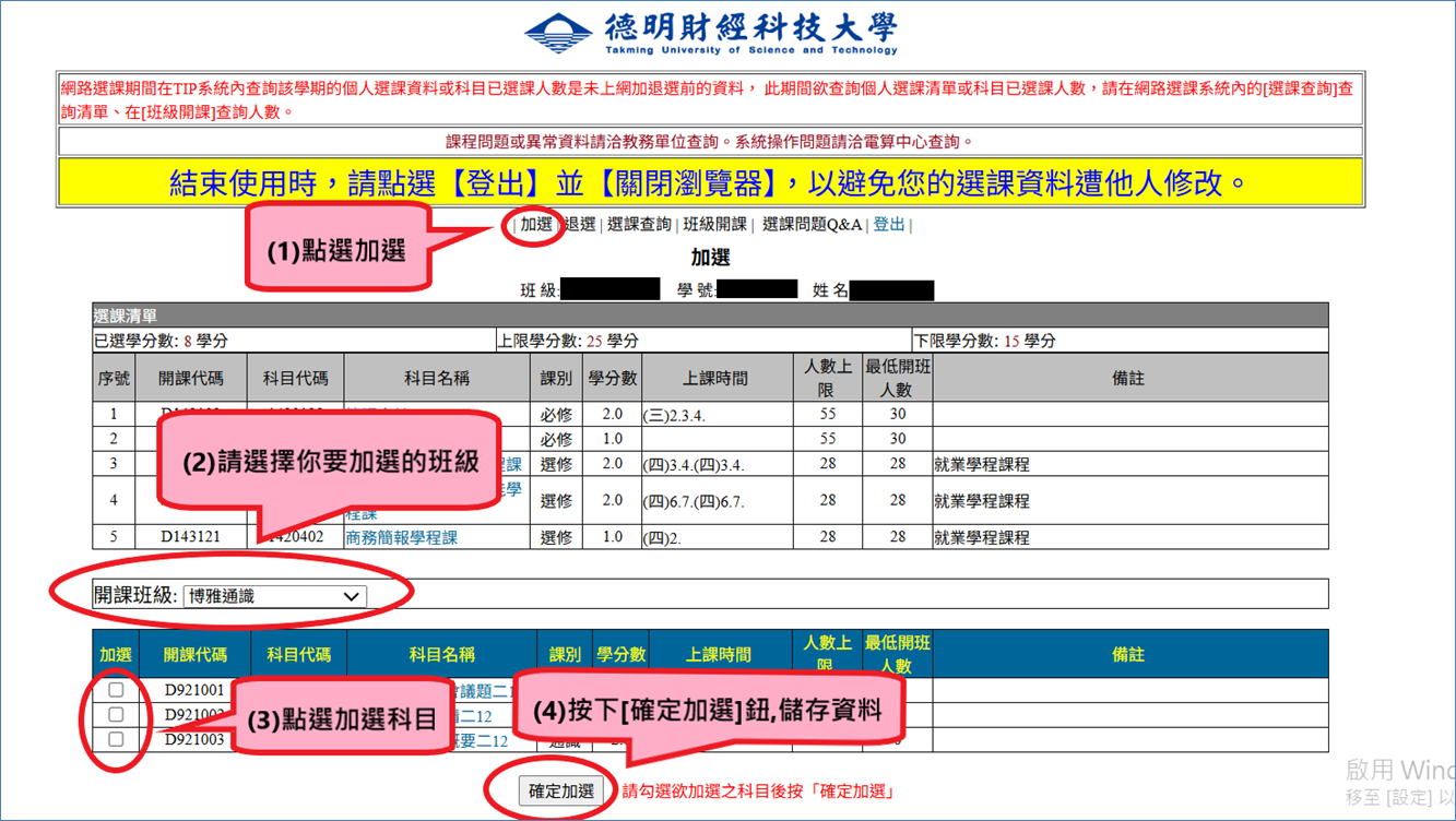 4. ¥[¿ï§@·~¡GÂI¿ï[¥[¿ï]¡A±µµÛ¿ï¾Ü[¶}½Ò¯Z¯Å]¡AµM«áÂI¿ï¥[¿ï¬ì¥Ø¡A³Ì«á«ö[½T©w¥[¿ï]«ö¶s¡C